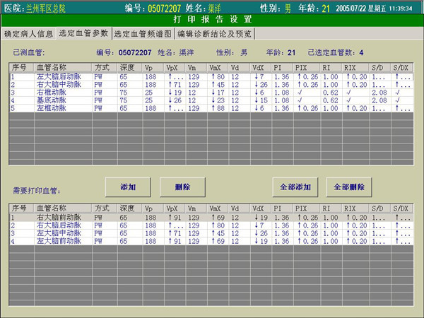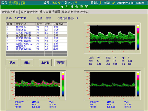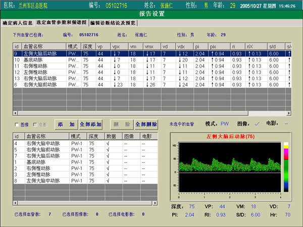 使用超聲經顱多普勒檢測時,需要查看受檢者的血管參數和血流頻譜圖。在超聲經顱多普勒血流分析儀選擇血管參數時,界面列表中將自動顯示與正常值的偏差值,讓醫生一目了然地掌握該病人的參數異常情況,節約了分析時間。在選擇頻譜圖時醫生可根據已檢測的血管頻譜圖像進行選擇,是否添加到超聲經顱多普勒血流分析儀報告中。