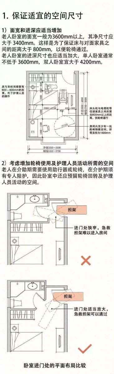 來自:搜建筑 第一部分:臥室篇 相對于中青年人群比較重視的臥室私密性,老人臥室更需要的是安全性和舒適度。因此,老人臥室的空間設(shè)計應(yīng)遵循以下四大設(shè)計原則:保證適宜的空間…