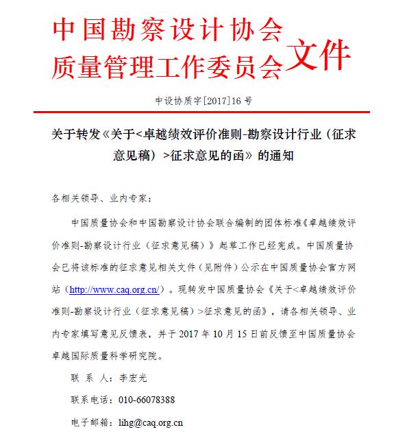 中勘協(xié)質(zhì)量管理委員會(huì)關(guān)于卓越績效評價(jià)準(zhǔn)則-勘察設(shè)計(jì)行業(yè)(征求意見稿)征求意見
