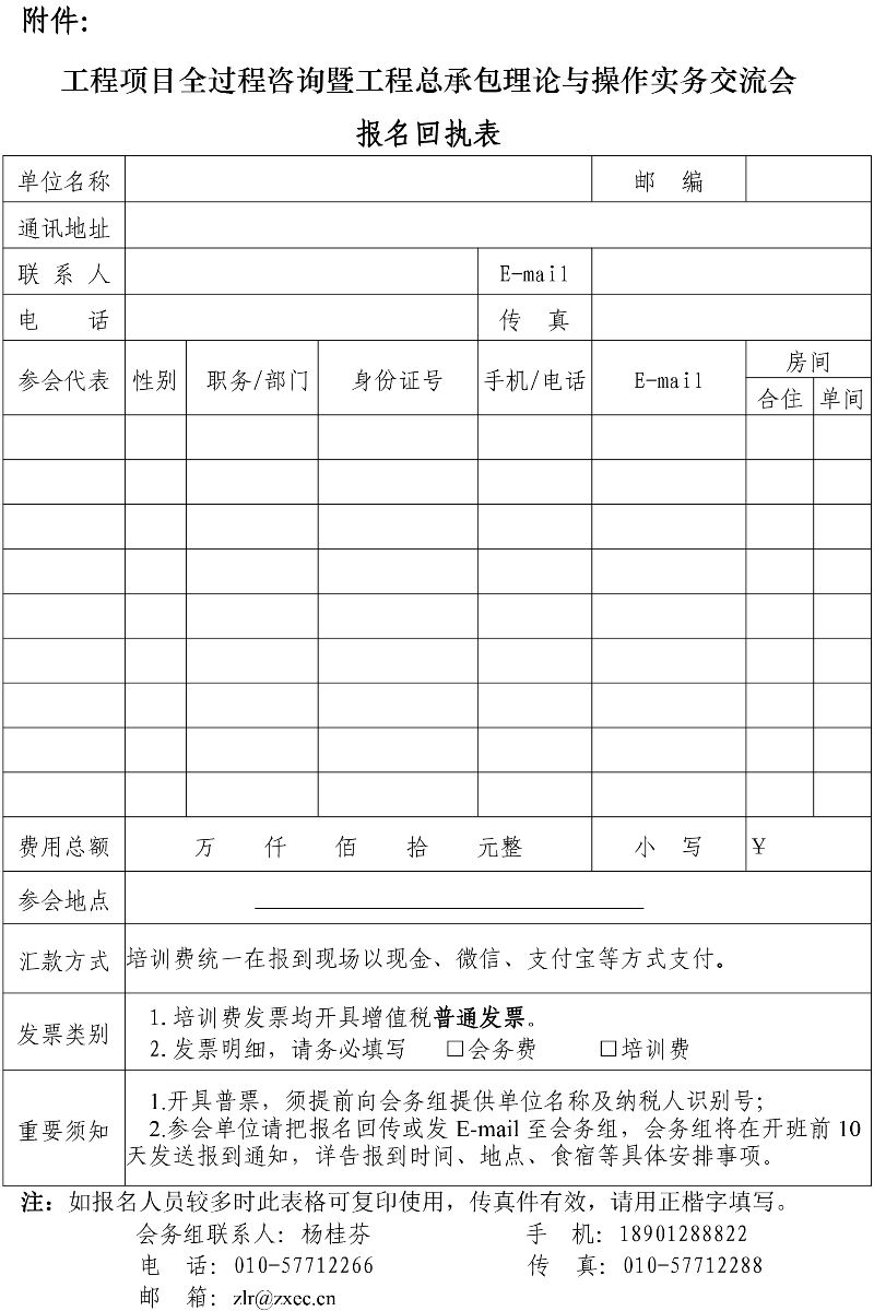附件:“工程項目全過程咨詢暨工程總承包理論與操作實務(wù)交流會”報名回執(zhí)
