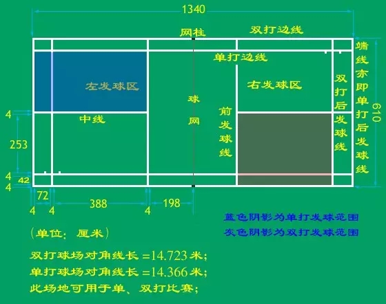 羽毛球場(chǎng)地是一個(gè)長(zhǎng)方形,長(zhǎng)13.40米,單打場(chǎng)地寬5.18米、雙打場(chǎng)地寬6.10米。球場(chǎng)四周2米以內(nèi)、上空9米以內(nèi)不得有任何障礙物。場(chǎng)地線的顏色最好是白色、黃色或其他容易辨別的顏色。場(chǎng)地上的畫線的寬度均為4厘米,所有場(chǎng)地線都是它所確定區(qū)域的組成部分。