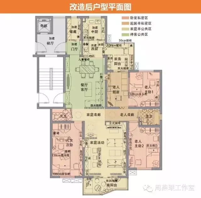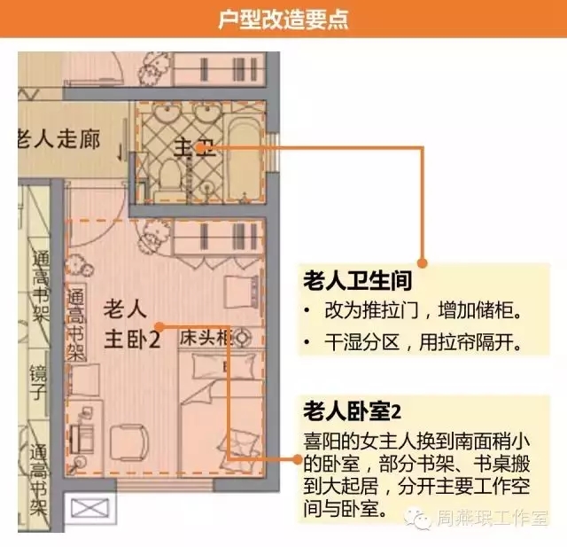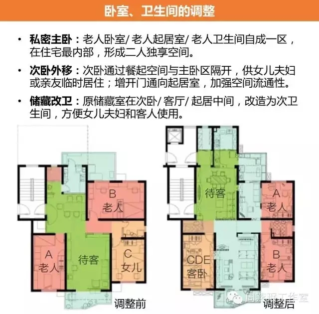 2. 重新分配臥室、衛(wèi)生間的面積,為三代同堂家庭提供合理的使用空間。