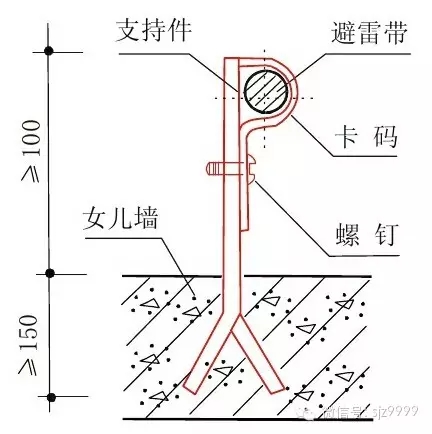 (3)外露的避雷帶應(yīng)采用熱鍍鋅的專門(mén)夾式支持碼支持,避免支持件與避雷帶焊接(如圖示)。