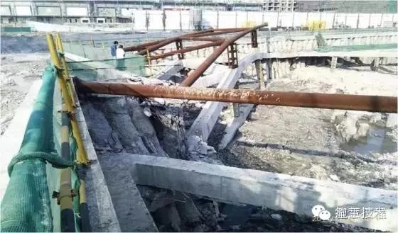 主要是由于施工搶進度,超量挖土,支撐架設跟不上,是圍護體系缺少大量設計上必須的支撐,或者由于施工單位不按圖施工,抱僥幸心理,少加支撐,致使圍護體系應力過大而折斷或支撐軸力過大而破壞或產(chǎn)生大變形。下圖為2011年杭州某深基坑圍護樁折斷事故。