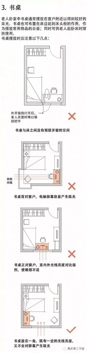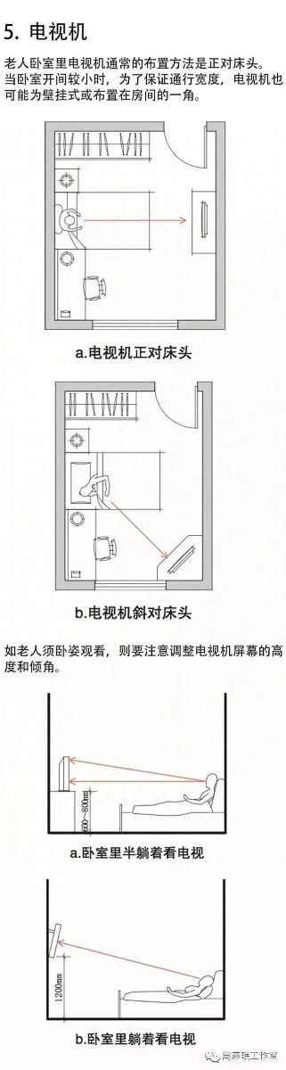 臥室在老年住宅中除了承擔(dān)老人常規(guī)的睡眠功能外,往往還會進(jìn)行許多其他活動,例如閱讀報紙、看電視、上網(wǎng)等。對于行動不便的臥床老人而言,臥室更成為老人生活的主要場所。臥室中家具的選擇和擺放直接影響著空間的安全性和舒適度,讓我們來看看老人臥室中家具的學(xué)問。