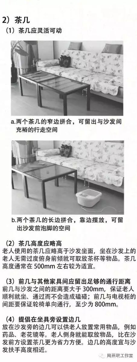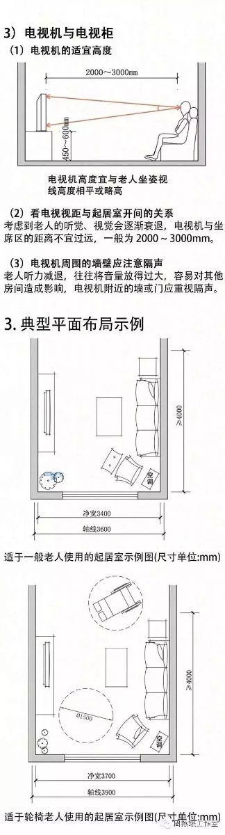 起居室是老人進(jìn)行聊天、待客等家庭活動和看電視、休閑健身等娛樂活動的主要場所。在設(shè)計時,應(yīng)迎合老人的心理需求和活動能力,促進(jìn)老人和家人以及外界環(huán)境之間的交流。
