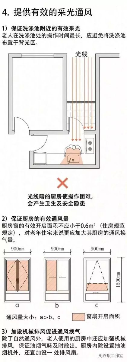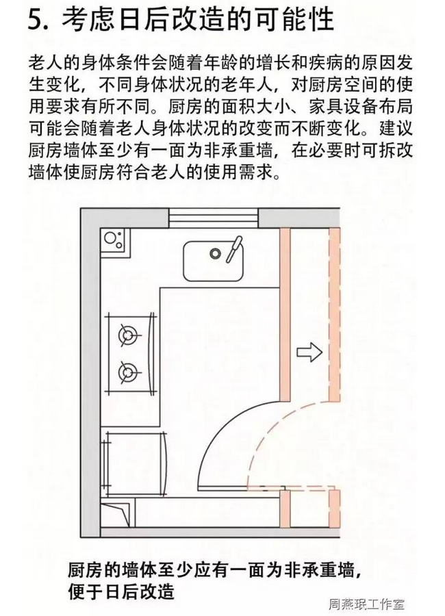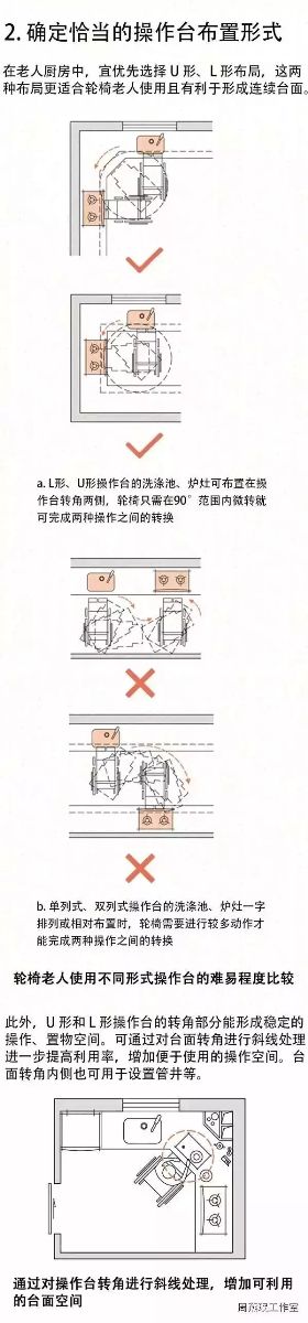 周到細(xì)致的廚房設(shè)計是保證老人實現(xiàn)自主生活的基礎(chǔ)。老人日常的主要活動很多是圍繞廚房展開的,在廚房中停留的時間也相對較長。老人廚房設(shè)計中不可不注意以下五大要點。