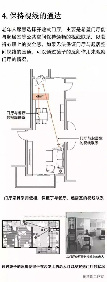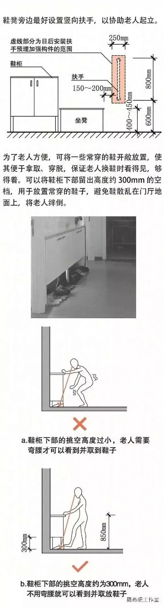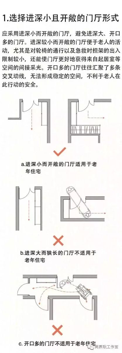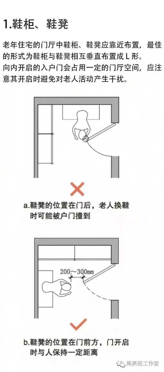 門廳在住宅中所占面積雖然不大,但使用頻率較高。老人外出或回家時,往往要在門廳完成許多動作,例如換鞋、穿衣、開關(guān)燈、拿鑰匙等。因此,門廳的各個功能須安排得緊湊有序,保證老人的動作順暢、安全。老年住宅的門廳空間設(shè)計通常需遵循以下五大原則。