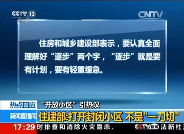 房和城鄉(xiāng)建設部表示,要正確理解“逐步打開封閉小區(qū)和單位大院”,并不是“一刀切”,也不是“一哄而起”,更不能簡單地理解為“拆圍墻”。住房和城鄉(xiāng)建設部表示,要認真全面理解好“逐步”兩個字,“逐步”就是要有計劃,要有輕重緩急。