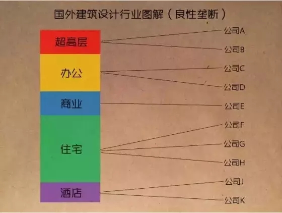 不可否認(rèn)房地產(chǎn)行業(yè)為國內(nèi)建筑設(shè)計公司提供主要的業(yè)務(wù)來源。國內(nèi)房地產(chǎn)是資源導(dǎo)向型行業(yè),這導(dǎo)致房地產(chǎn)下游行業(yè)公司很難因為技術(shù)優(yōu)勢或者設(shè)計優(yōu)勢而占領(lǐng)市場,下游行業(yè)整體混亂,缺乏行業(yè)標(biāo)準(zhǔn)。建筑設(shè)計行業(yè)里的很多公司最后都從創(chuàng)意設(shè)計產(chǎn)業(yè)淪為了為房地產(chǎn)公司代工的低附加值的加工制造業(yè)??纯捶康禺a(chǎn)其他下游行業(yè)吧,家裝、施工、建材行業(yè)幾乎都是混亂至極。國內(nèi)房地產(chǎn)行業(yè)排名第一的公司占市場份額1%都不到。這在其他以設(shè)計和技術(shù)導(dǎo)向型行業(yè)是不可想象的,2014年排名第一的大眾集團(tuán)占國內(nèi)汽車市場份額18.7%。