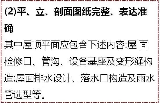 3.屋面排水設(shè)計(jì)要合理,如:排水是否順暢,排水坡度是否合適(卷材、剛性防水最小坡度2%,檐溝縱坡不小于1%。溝底落差