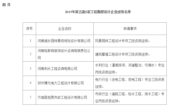 附件:2017年第五批5家工程勘察設(shè)計(jì)企業(yè)延續(xù)名單