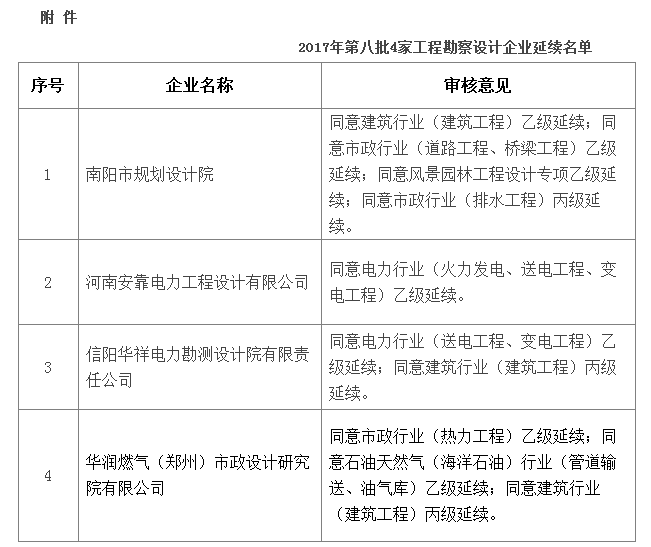 附件:2017年第八批4家工程勘察設(shè)計(jì)企業(yè)延續(xù)名單
