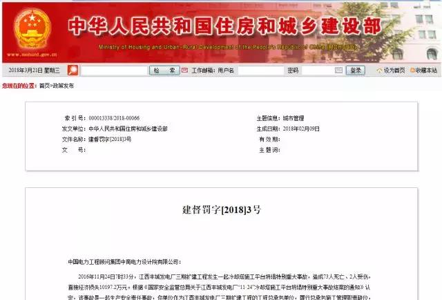 3月20日, 住建部網(wǎng)站公布了對江西豐城發(fā)電廠三期擴(kuò)建工程總承包單位中國電力工程顧問集團(tuán)中南電力設(shè)計(jì)院有限公司的處罰決定。
