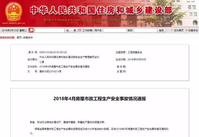 住建部于5月14日公布了《2018年4月房屋市政工程生產(chǎn)安全事故情況通報(bào)》(以下簡(jiǎn)稱《通報(bào)》)。《通報(bào)》顯示,今年4月,全國(guó)共發(fā)生安全生產(chǎn)事故67起,死亡75人;發(fā)生較大及以上事故1起、死亡4人,比去年同期事故起數(shù)增加1起、死亡人數(shù)增加4人。
