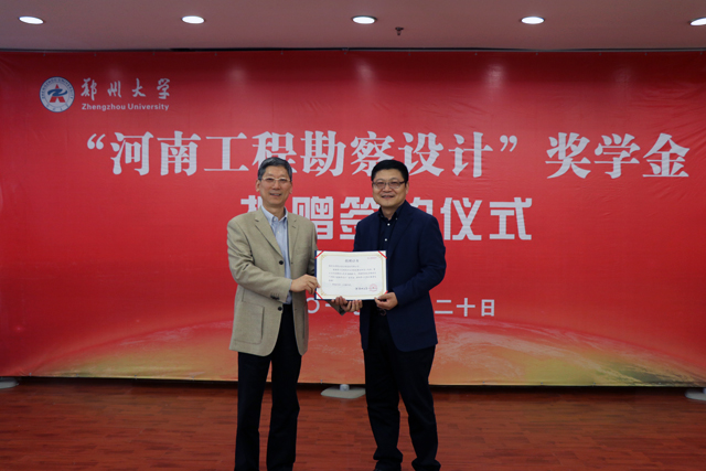 4月20日,“河南工程勘察設計”獎學金簽約儀式在鄭大校園舉行。鄭州大學綜合設計研究院有限公司是捐資企業(yè)之一,院長關(guān)罡上臺領(lǐng)取捐贈證書。