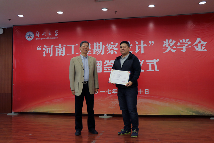 4月20日,“河南工程勘察設(shè)計(jì)”獎學(xué)金簽約儀式在鄭大校園舉行。河南省城鄉(xiāng)建筑設(shè)計(jì)院有限公司是捐資企業(yè)之一,該院經(jīng)營部主任張鑫上臺領(lǐng)取捐贈證書。