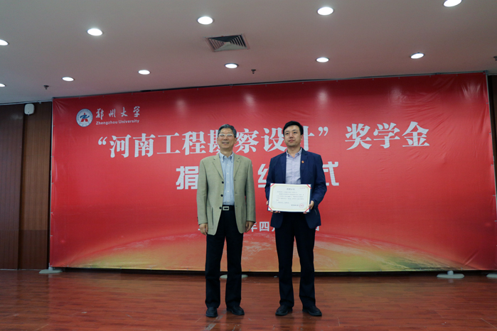 4月20日,“河南工程勘察設(shè)計”獎學(xué)金簽約儀式在鄭大校園舉行。中水電十一局鄭州科研設(shè)計院是捐資企業(yè)之一,該院辦公室主任馬臣上臺領(lǐng)取捐贈證書。