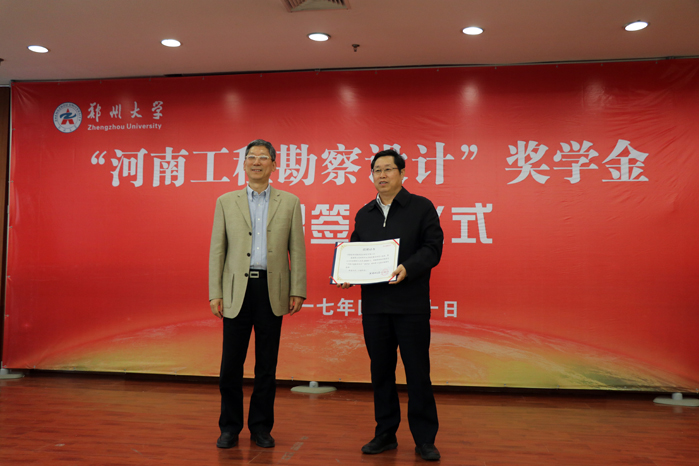 4月20日,“河南工程勘察設(shè)計(jì)”獎(jiǎng)學(xué)金簽約儀式在鄭大校園舉行。河南省水利勘測(cè)設(shè)計(jì)研究有限公司是捐資企業(yè)之一,該公司董事長(zhǎng)翟淵軍上臺(tái)領(lǐng)取捐贈(zèng)證書。