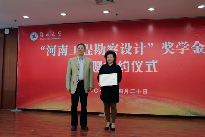 4月20日,“河南工程勘察設(shè)計(jì)”獎學(xué)金簽約儀式在鄭大校園舉行。河南徐輝建筑工程設(shè)計(jì)有限公司是捐資企業(yè)之一,該公司副總經(jīng)理任巖上臺領(lǐng)取捐贈證書。