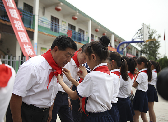 活動現(xiàn)場,張書記雙手將象征著愛心和溫暖的桌椅捐贈牌交給李士屯小學(xué)張校長,隨后張校長向河南二建集團回贈了“愛心助力學(xué)生成長,情系教育惟宏隆德”的錦旗表示感謝,學(xué)生代表上前為各位領(lǐng)導(dǎo)系上紅領(lǐng)巾表達他們的感恩之心與美好祝愿。