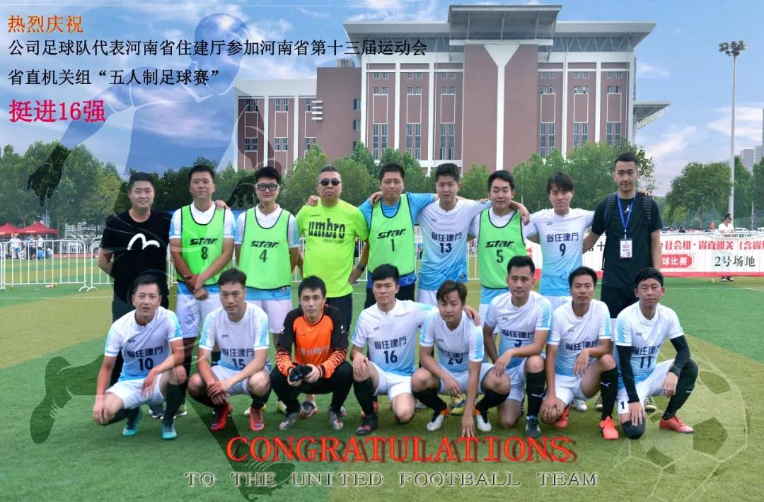 近日,在省住建廳省直機(jī)關(guān)黨委與省建筑設(shè)計(jì)研究院有限公司黨委、工會的大力支持下,公司足球隊(duì)聯(lián)合住建廳定額站、住建廳質(zhì)監(jiān)站等兄弟單位員工組建住建廳2018足球聯(lián)隊(duì)參加了河南省第十三屆運(yùn)動會省直機(jī)關(guān)組“五人制足球賽”,球隊(duì)從63支省直機(jī)關(guān)參賽隊(duì)伍中脫穎而出,挺進(jìn)16強(qiáng),取得了良好成績。