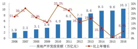 隨著供給側(cè)結(jié)構(gòu)性改革不斷深化,2015年全國房地產(chǎn)開發(fā)完成投資比上年僅增長1%,投資規(guī)模近9.6萬億元,基本與上年持平。進(jìn)入2016年投資形勢(shì)有所好轉(zhuǎn),全年房地產(chǎn)開發(fā)投資10.3萬億元,比上年增長6.9%,但與上年同期相比投資增長均未過10%。