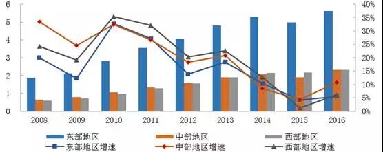從區(qū)域上看,東部地區(qū)依然是房地產(chǎn)投資的主要區(qū)域。2016年我國東部地區(qū)完成房地產(chǎn)投資5.6萬億元,高于中西部房地產(chǎn)完成投資的總和;東部地區(qū)仍是房地產(chǎn)投資的主要區(qū)域,給建筑設(shè)計(jì)企業(yè)帶來的業(yè)務(wù)機(jī)會(huì)也更多。然而,2014年前中西部房地產(chǎn)完成投資增速普遍高于東部地區(qū),2015年中西部房地產(chǎn)完成投資增速減緩,但2016年中西部房地產(chǎn)完成投資增速依然高于東部地區(qū),未來中西部發(fā)展速度會(huì)繼續(xù)高于東部地區(qū)。