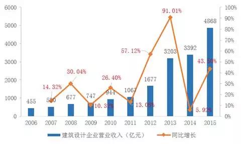 近年來,受益于城鎮(zhèn)化進(jìn)程的推進(jìn),我國建筑設(shè)計(jì)行業(yè)發(fā)展迅速,隊(duì)伍數(shù)量、經(jīng)營規(guī)模、管理水平和經(jīng)濟(jì)效益均得到了較快發(fā)展。2010-2014年,整體呈現(xiàn)增長態(tài)勢(shì),但增幅不穩(wěn),受宏觀經(jīng)濟(jì)增速放緩、房地產(chǎn)行業(yè)景氣度下滑等因素的影響,2014年建筑設(shè)計(jì)企業(yè)的營業(yè)收入增長速度大幅度下降,2015年增幅有所回升,但仍未恢復(fù)之前較高水平。