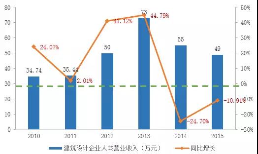 把行業(yè)從業(yè)人員數(shù)量考慮進(jìn)去,情況更加令人擔(dān)憂。建筑設(shè)計(jì)企業(yè)人均營業(yè)收入在2010-2013年一直處于增長態(tài)勢(shì),2014年這種樂觀的情況被打破,開始呈現(xiàn)下降趨勢(shì),2014和2015年增長率均為負(fù)值,說明建筑設(shè)計(jì)行業(yè)人員數(shù)量過快增長,出現(xiàn)產(chǎn)能嚴(yán)重過?,F(xiàn)象。2015年建筑設(shè)計(jì)企業(yè)人均營業(yè)收入49萬元,低于全國勘察設(shè)計(jì)行業(yè)平均水平(89萬)。