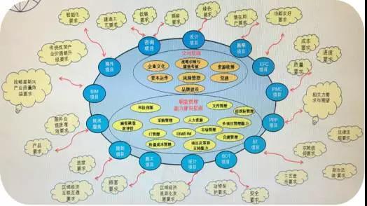 北京中設(shè)認(rèn)證服務(wù)有限公司根據(jù)20年積累的工程勘察設(shè)計(jì)行業(yè)專業(yè)化審核經(jīng)驗(yàn),采用通用質(zhì)量管理體系要求與行業(yè)特殊要求相融合的AB模式,組織試點(diǎn)單位編制了《工程勘察設(shè)計(jì)行業(yè)質(zhì)量管理體系認(rèn)證標(biāo)準(zhǔn)》《工程勘察設(shè)計(jì)行業(yè)質(zhì)量管理體系分級(jí)認(rèn)證和評(píng)價(jià)標(biāo)準(zhǔn)》以及《整合管理體系認(rèn)證實(shí)施指南》。這些升級(jí)版標(biāo)準(zhǔn)是以GB/T19001《質(zhì)量管理體系要求》標(biāo)準(zhǔn)為基礎(chǔ),融入GB/T19004《追求組織的持續(xù)成功質(zhì)量管理方法》、GB/T19580《卓越績(jī)效評(píng)價(jià)準(zhǔn)則》的質(zhì)量管理標(biāo)準(zhǔn)和方法,并結(jié)合工程勘察設(shè)計(jì)行業(yè)標(biāo)桿企業(yè)在目標(biāo)管理、項(xiàng)目管理、風(fēng)險(xiǎn)管理、知識(shí)管理、信息化管理等方面的良好實(shí)踐經(jīng)驗(yàn),在影響勘察設(shè)計(jì)企業(yè)質(zhì)量管理效果的重點(diǎn)環(huán)節(jié)以及需要提升的、困惑的或容易出現(xiàn)問(wèn)題的一些細(xì)節(jié),細(xì)化了評(píng)分標(biāo)準(zhǔn),然后通過(guò)認(rèn)證審核所獲得的分?jǐn)?shù)確定認(rèn)證級(jí)別(五星級(jí)、四星級(jí)、三星級(jí))。分級(jí)認(rèn)證標(biāo)準(zhǔn)內(nèi)容包括:組織環(huán)境、領(lǐng)導(dǎo)作用、策劃、支持(人力資源、技術(shù)資源與知識(shí)管理、信息化、BIM及應(yīng)用、財(cái)務(wù)管理、文件及檔案管理、基礎(chǔ)設(shè)施及運(yùn)行環(huán)境)、運(yùn)行(工程勘察、工程咨詢?cè)O(shè)計(jì)、工程總承包、項(xiàng)目管理)、績(jī)效評(píng)價(jià)、改進(jìn)等10大過(guò)程,并將 “工程勘察設(shè)計(jì)管理要素云圖” (如下圖)體現(xiàn)的要求融入到了標(biāo)準(zhǔn)的設(shè)計(jì)中,制定了10大過(guò)程的分解評(píng)分標(biāo)準(zhǔn),目的是提高全要素生產(chǎn)力。