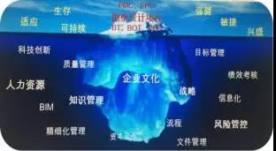 過(guò)去提到質(zhì)量管理,就很容易只想到或看到表面上的勘察設(shè)計(jì)項(xiàng)目質(zhì)量,而導(dǎo)致項(xiàng)目差錯(cuò)甚至失誤的深層次原因沒(méi)有被重視和挖掘。項(xiàng)目層面的問(wèn)題只是冰山一角(如下圖),構(gòu)成支撐和支持作用的隱藏在冰山下面的企業(yè)文化、風(fēng)險(xiǎn)管理、科技創(chuàng)新、知識(shí)管理、人力資源管理、績(jī)效考核等方面的問(wèn)題以及結(jié)合業(yè)務(wù)特點(diǎn)的精細(xì)化管理制度不完善等問(wèn)題,才是導(dǎo)致質(zhì)量問(wèn)題反復(fù)出現(xiàn)的深層次原因。