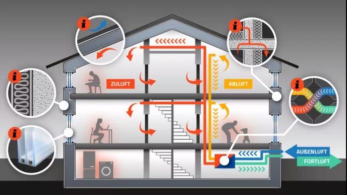 這是一棟最具現(xiàn)代感的房子的解剖圖,其中為了居住證的生活需求,所展示幾大關(guān)鍵技術(shù)要素:保溫、門窗、氣密性、無熱橋和新風系統(tǒng)。
