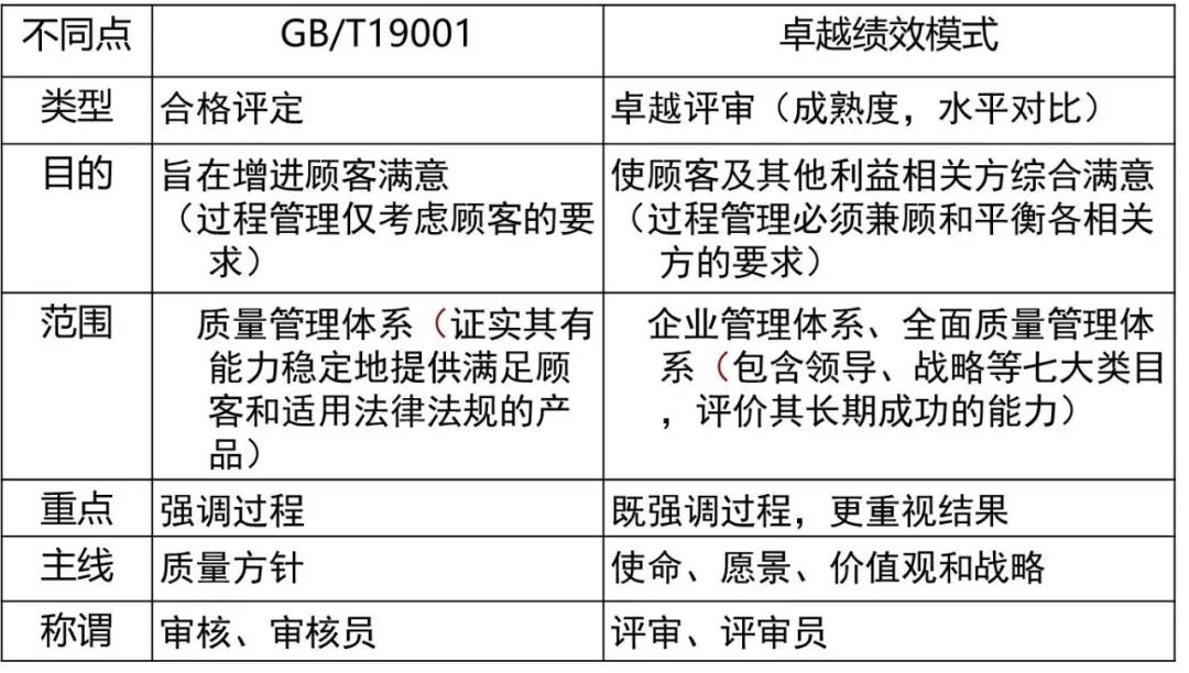 此外,卓越績效評價與質(zhì)量管理體系審核也有本質(zhì)上的不同,前者屬于診斷式的評價,從管理的效率和效果入手,旨在發(fā)現(xiàn)組織最強(qiáng)和最需要改進(jìn)的方面;后者則是對過程的合格評定,從符合性入手兼顧有效性,重在發(fā)現(xiàn)與規(guī)定要求的偏差。