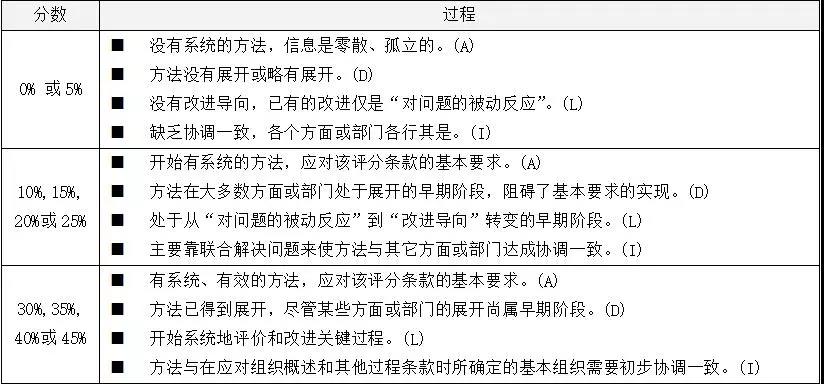 例如,“如何確定組織的使命、愿景和價值觀”。對于該類“如何”問題的回答,按照本標(biāo)準(zhǔn)“5.0 評價方法”和“附錄B卓越績效評價要素和評分指南”需要給出幾個方面的信息:應(yīng)對條款要求的“是什么方法”(稱為“方法”)、該方法是“怎么實施的”(稱為“展開”)、是否對該方法和該實施過程進(jìn)行評價(稱為“學(xué)習(xí)”),該方法是否與標(biāo)準(zhǔn)其他條款相協(xié)調(diào)一致(稱為“整合”)。依據(jù)組織對以上四個方面的信息,對照“評分要求”中六個檔次中的描述(見表2),評審員可以給出一個成熟度百分比。依據(jù)對“高層領(lǐng)導(dǎo)的作用”的所有問題的回答信息,評審員可以給出該條款的分值。