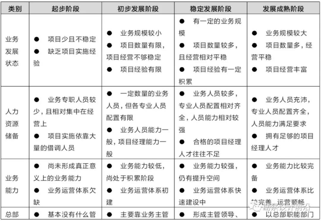 一般而言,勘察設(shè)計(jì)企業(yè)多元化業(yè)務(wù)的發(fā)展過程可以分為四個(gè)階段:起步階段、初步發(fā)展階段、穩(wěn)定發(fā)展階段、發(fā)展成熟階段。各個(gè)階段的業(yè)務(wù)發(fā)展?fàn)顟B(tài)、人力資源儲(chǔ)備、業(yè)務(wù)能力、總部管理方式、管控體系建設(shè)情況如下表1: