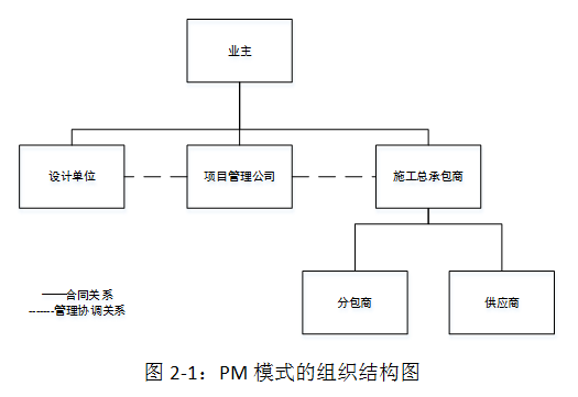 項(xiàng)目管理模式(PM: project management)是指工程項(xiàng)目管理企業(yè)接受業(yè)主的委托,按照合同的約定,代表業(yè)主對(duì)項(xiàng)目的組織實(shí)施進(jìn)行全過程或若干階段的管理和服務(wù)。其職責(zé)范圍包括項(xiàng)目的決策階段的可行性報(bào)告的編制和項(xiàng)目策劃、招標(biāo)代理、設(shè)計(jì)管理、采購管理和施工管理以及竣工驗(yàn)收等服務(wù)。PM合同是委托合同,接受委托的工程項(xiàng)目管理企業(yè)代表業(yè)主對(duì)工程建設(shè)的質(zhì)量、安全、進(jìn)度、成本、信息等要素進(jìn)行管理和控制,按照合同約定收取一定的報(bào)酬和承擔(dān)一定的管理責(zé)任。PM模式的組織結(jié)構(gòu)圖如下: