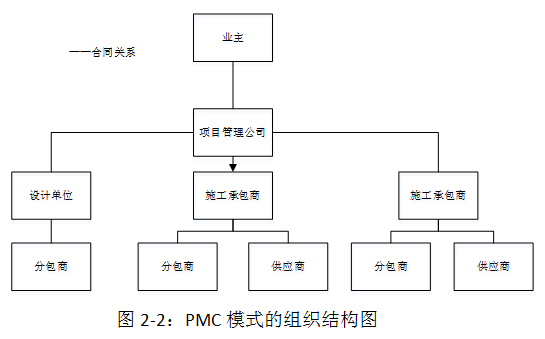 項(xiàng)目管理承包(PMC: project management contracting)模式下,業(yè)主直接與管理承包商簽訂合同,再由管理承包商和相關(guān)設(shè)計(jì)方和施工方簽訂合同。PMC模式的組織結(jié)構(gòu)圖如下: