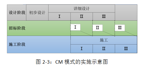 CM模式又稱階段發(fā)包模式(phased construction method)或快速軌道模式(fast track method)。最早起源于美國。這種模式下,業(yè)主委托具有施工經(jīng)驗(yàn)的CM公司參與工程項(xiàng)目的設(shè)計(jì)階段,為設(shè)計(jì)公司提供施工方面的經(jīng)驗(yàn),保證設(shè)計(jì)的可施工性。CM公司和設(shè)計(jì)單位是合作關(guān)系。這種模式的出發(fā)點(diǎn)是采用“邊設(shè)計(jì)、邊發(fā)包、邊施工”的方式,盡可能的縮短項(xiàng)目的工期,當(dāng)然,需要設(shè)計(jì)、招標(biāo)和施工環(huán)節(jié)充分的銜接。CM模式的實(shí)施示意圖如下: