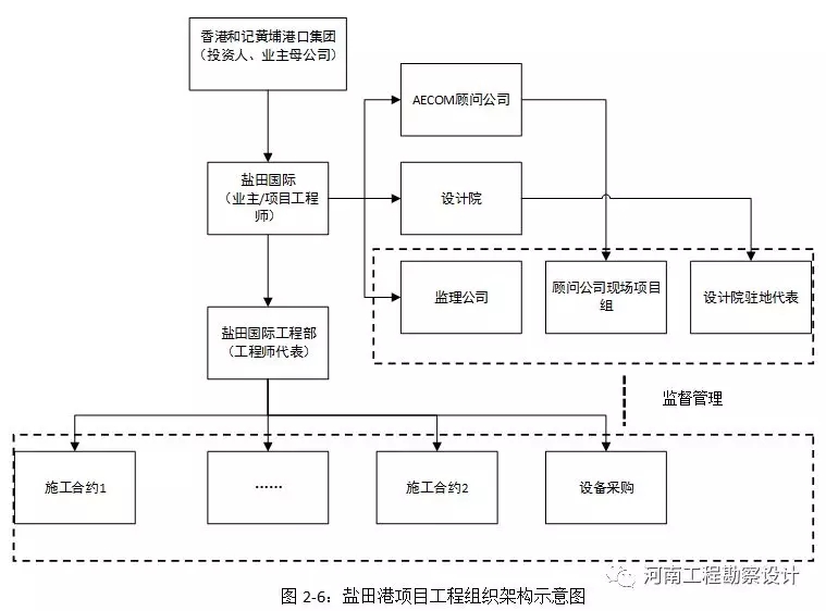 深圳鹽田港項(xiàng)目是國(guó)內(nèi)大型港口建設(shè)中較早的引入國(guó)際咨詢(xún)和國(guó)際項(xiàng)目管理理念的項(xiàng)目。從1994年田港二期工程開(kāi)始時(shí),鹽田國(guó)際集裝箱碼頭有限公司就委托國(guó)際知名的工程咨詢(xún)公司AECOM(艾奕康)設(shè)計(jì)集團(tuán)提供全過(guò)程、全方位的工程咨詢(xún)和工程管理服務(wù)。AECOM公司作為顧問(wèn)公司直接對(duì)業(yè)主負(fù)責(zé),業(yè)主通過(guò)顧問(wèn)公司進(jìn)行項(xiàng)目管理,在月度例會(huì)上,業(yè)主和顧問(wèn)公司一起向母公司和記黃埔港口集團(tuán)匯報(bào)工作。
