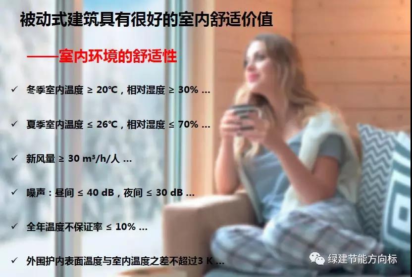 我們可以通過三個層次來深度學(xué)習(xí)一下被動房的那一系列學(xué)術(shù)指標(biāo)。被動房第一維度的目標(biāo)是室內(nèi)舒適性,這個一般通過室內(nèi)外的溫濕度差異你體感就能夠感受出來,但是用學(xué)術(shù)指標(biāo)的話,就是下面這一系列的數(shù)值了。