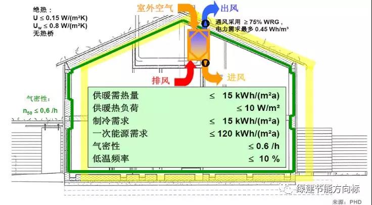 在保障第一維度目標(biāo)實現(xiàn)的前提下,再用第二維度的能耗目標(biāo)來約束,達到這兩個條件的房子才能通過認(rèn)證,成為合格的被動房。當(dāng)然,能耗需求都是可以采用專業(yè)的軟件計算出來(PHPP)轉(zhuǎn)化為建筑本體的規(guī)劃指標(biāo)和建筑熱工指標(biāo)、氣密性指標(biāo)以及新風(fēng)熱回收效率等。下面這一組指標(biāo)是一個經(jīng)典的參考,但它絕不是被動房的標(biāo)配。一個嚴(yán)謹(jǐn)?shù)谋粍臃吭O(shè)計是通過科學(xué)的模擬計算得來的,絕對不能像中國的建筑節(jié)能設(shè)計標(biāo)準(zhǔn)那樣只通過規(guī)定一組熱工設(shè)計指標(biāo)就行的。所以我現(xiàn)在很奇怪,中國北方各省市紛紛出臺的被動式低能耗居住建筑設(shè)計指標(biāo),乍一看那些指標(biāo)都是照搬德國的經(jīng)驗值,太缺少科學(xué)的分析邏輯策略了,國人還把它們當(dāng)做標(biāo)準(zhǔn)答案去建設(shè)被動房,實在是愚昧??!