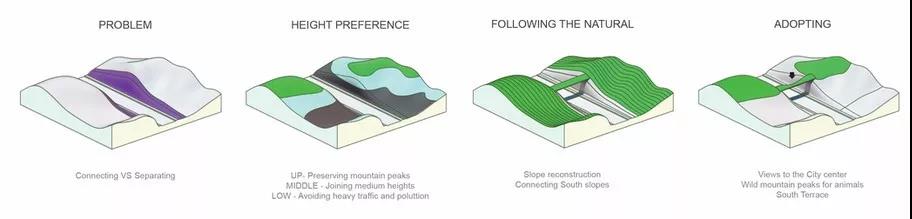 為了優(yōu)先保護動物棲息以及活動場地,設(shè)計團隊保有了原來的山峰,以此來創(chuàng)造出零人類打擾的區(qū)域。橋梁的結(jié)構(gòu)性斜坡幫助保有了原來的山景。山間走道以人類和野生動物的關(guān)系區(qū)分不同的山景立面,使其形成了一個柔美的波浪形結(jié)構(gòu)中心,并以此形成交通循環(huán)和休息的場所,同時還成為了整個設(shè)施最關(guān)鍵的一部分。