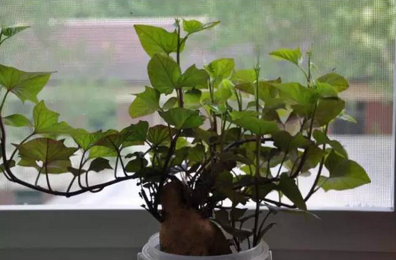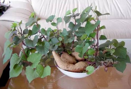 注:如果您會一點(diǎn)造型設(shè)計,便可以來個紅薯盆景,剪下的葉子可以炒菜吃。