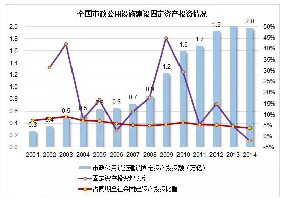 1978年我國(guó)城市市政公用設(shè)施固定資產(chǎn)投資12億元,占全國(guó)全社會(huì)固定資產(chǎn)投資總額的1.8%,此時(shí)縣城市政公用設(shè)施固定資產(chǎn)投資的數(shù)據(jù)非常之?。▏?guó)家從2000年之后才開始統(tǒng)計(jì)該項(xiàng)數(shù)據(jù))。2014年全國(guó)市政公用設(shè)施建設(shè)固定資產(chǎn)投資總額達(dá)到1.98萬億元(其中:城市1.62萬億,縣城0.36萬億,鄉(xiāng)鎮(zhèn)的數(shù)據(jù)本文均不納入統(tǒng)計(jì)),占同期全社會(huì)固定資產(chǎn)投資總額的3.9%,該比例自2001年以來一直保持在4%-9%,相比改革開放初期大大提高。