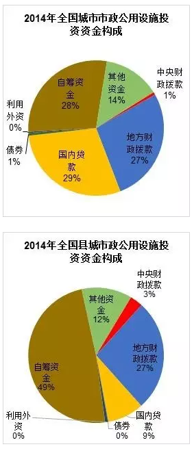 2014年,全國(guó)城市市政公用設(shè)施建設(shè)固定資產(chǎn)投資資金1.62萬億元,其中,最大的三個(gè)來源是:國(guó)內(nèi)貸款4383億元、自籌資金4295億元、地方財(cái)政撥款4135億元。與城市相比,縣城市政公用設(shè)施建設(shè)投資難以獲得銀行貸款,主要靠自籌資金,資金構(gòu)成中,自籌資金比例接近50%,而銀行貸款比例僅9%,這也是縣城的市政公用設(shè)施建設(shè)不管是從建設(shè)總量,還是從增長(zhǎng)率來看都遠(yuǎn)不及城市市政建設(shè)的原因之一。