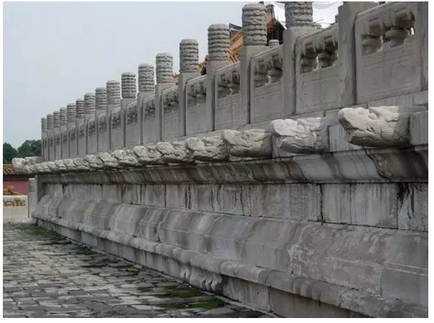 以故宮前三殿太和殿、中和殿和保和殿為例,前三殿建在8.13米高的三層臺基上,臺基四周欄桿的底部,有排放雨水的孔洞;每根望柱下還有一個雕琢精美的石龍頭,名曰“螭首”,其口內(nèi)為鑿通的圓孔,也是輔助排水的孔道。每逢雨天,雨水從1142個排水孔噴出,呈現(xiàn)“千龍噴水”景觀,逐層下落,流到院內(nèi),使得臺面無積水。臺基四周設(shè)有石槽排水溝。