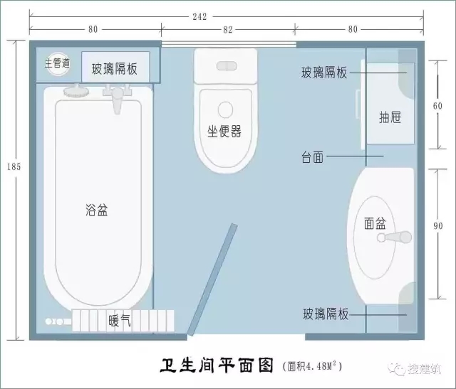 1.主人衛(wèi)生間臺(tái)面寬度560-600,長(zhǎng)度不小于900,高度850;;
