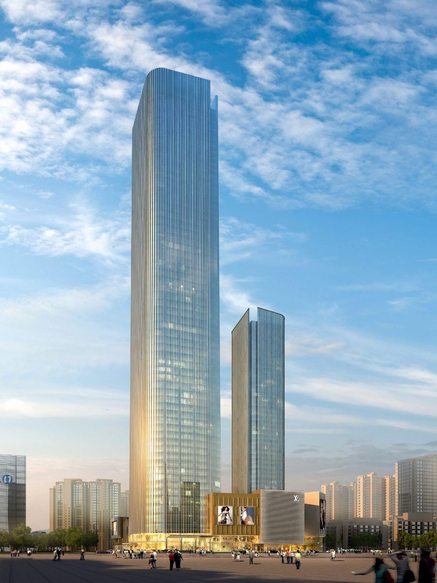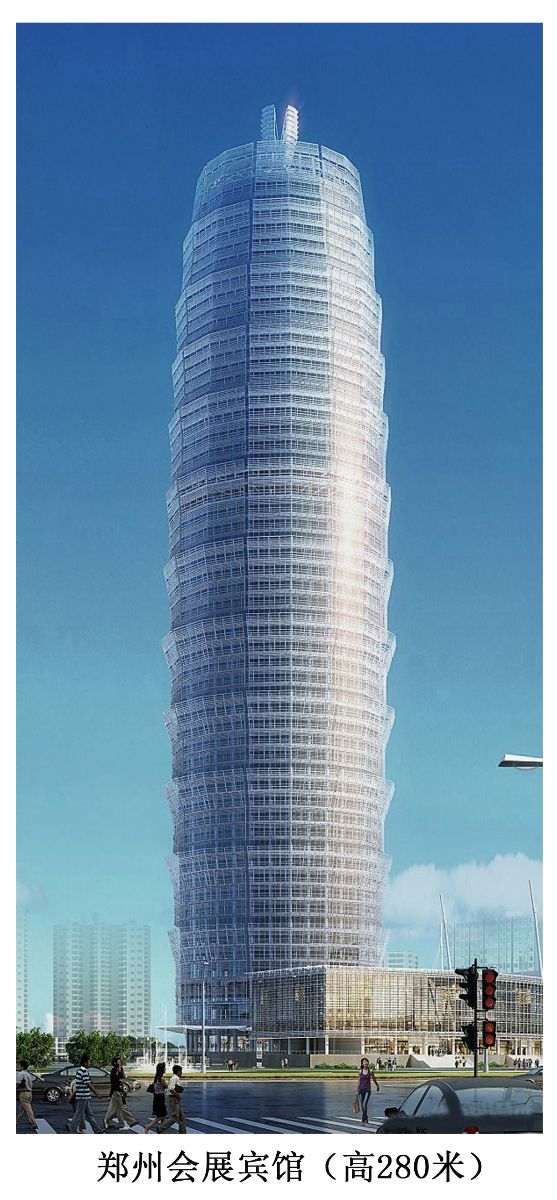 鄭州綠地廣場(chǎng)(鄭州會(huì)展賓館)工程, 河南省重點(diǎn)建設(shè)項(xiàng)目:總建筑面積231918 m2,有主體塔樓、水上娛樂(lè)裙房、大型商業(yè)裙房組成;主體塔樓直徑52.3m,總高度280m,地上64層,地下3層,基底埋深19.0m。