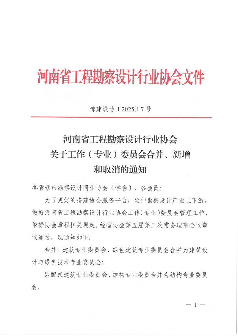 各省轄市勘察設(shè)計(jì)同業(yè)協(xié)會(huì)(學(xué)會(huì)),各會(huì)員: 為了更好的搭建協(xié)會(huì)服務(wù)平臺(tái),延伸勘察設(shè)計(jì)產(chǎn)業(yè)上下游,做好河南省工程勘察設(shè)計(jì)行業(yè)協(xié)會(huì)工作(專業(yè))委員會(huì)管理工作,依據(jù)協(xié)會(huì)章程相關(guān)規(guī)定,經(jīng)省協(xié)會(huì)第五屆第三次常務(wù)理事會(huì)議審議通過,現(xiàn)通知如下: 合并:建筑專業(yè)委員會(huì)、綠色建筑專業(yè)委員會(huì)合并為建筑設(shè)計(jì)與綠色技術(shù)專業(yè)委員會(huì);裝配式建筑專業(yè)委員會(huì)、結(jié)構(gòu)專業(yè)委員合并為結(jié)構(gòu)專業(yè)委員會(huì)。 新增:河南省工程勘察設(shè)計(jì)協(xié)會(huì)管道業(yè)委員會(huì) 取消:河南省工程勘察設(shè)計(jì)行業(yè)協(xié)會(huì)工程總承包工作委員會(huì) 2025年3月17日